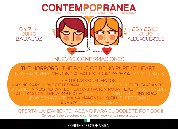 Ya habíamos comentado que el Festival Contempopránea se celebrará en 2014 en dos localizaciones, Badajoz en junio y Alburquerque en julio. Pues bien, ahora tenemos las nuevas confirmaciones de The Horrors, The Pains of Being Pure at Heart, Russian Red, Veronica Falls, Kokoscha y Odio París.