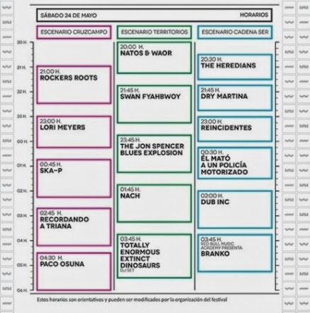 El Festival Territorios Sevilla se celebra en la capital hispalense estos próximos días 23 y 24 de mayo. La organización espera recibir a más de 20.000 personas para disfrutar de las actuaciones de Love of Lesbian, Loquillo, Anna Calvi, Mala Rodríguez, Lori Meyers, Reincidentes, Ska-P, The Jon Spencer Blues Explosion, Swan Fyahbwoy, Manel, Nach y muchos más. Pues bien, ya están disponibles los horarios para que cada cual se organice su itinerario sónico. Puedes consultarlos a continuación o en la web territoriossevilla.com/entradas.htm.