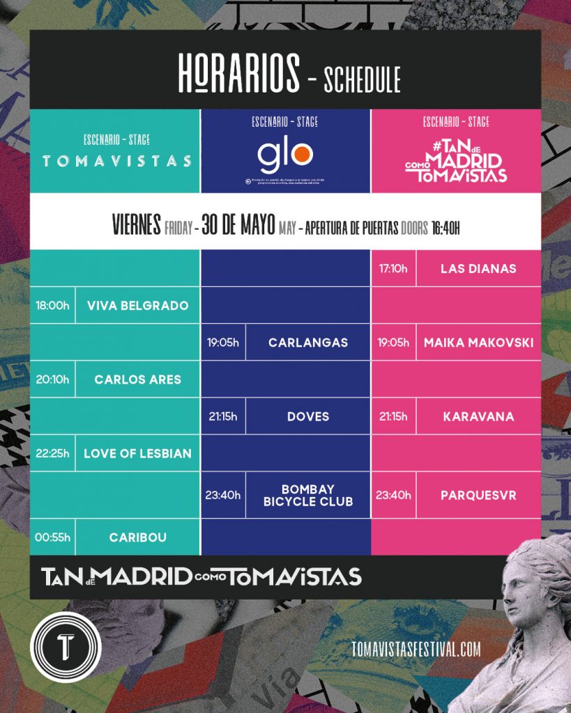 La jornada del viernes 30 arranca de nuevo en el escenario Tan de Madrid como Tomavistas, por donde pasará en primer lugar el corrosivo punk de Las Dianas. Acto seguido, el laureado ‘Bunker Rococo’ de Maika Makovski, la explosión rock de Karavana y la descarga de hits de Parquesvr.
