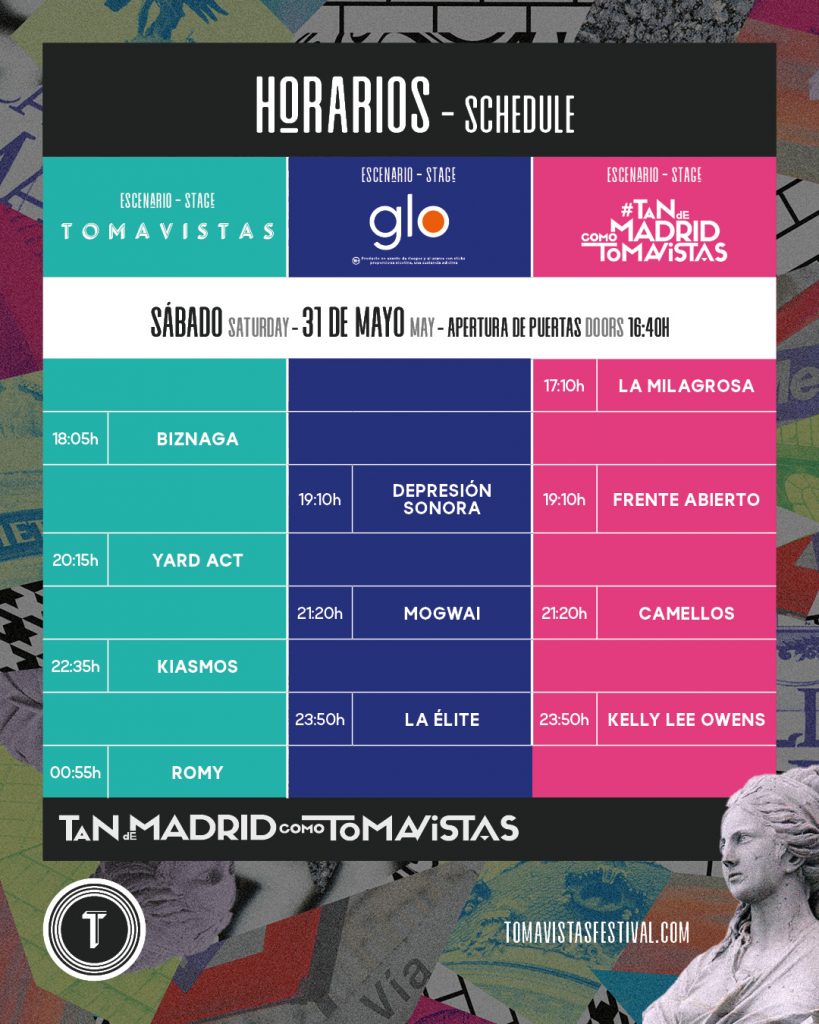 El broche de oro al festival se pondrá el sábado 31 de mayo, que volverá a tener las primeras notas en el escenario Tan de Madrid como Tomavistas. Por allí estará el post punk de La Milagrosa, la fusión de flamenco y rock de Frente Abierto, el arrollador directo de Camellos y la presentación oficial en Madrid del último disco de Kelly Lee Owens.