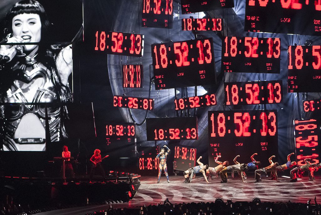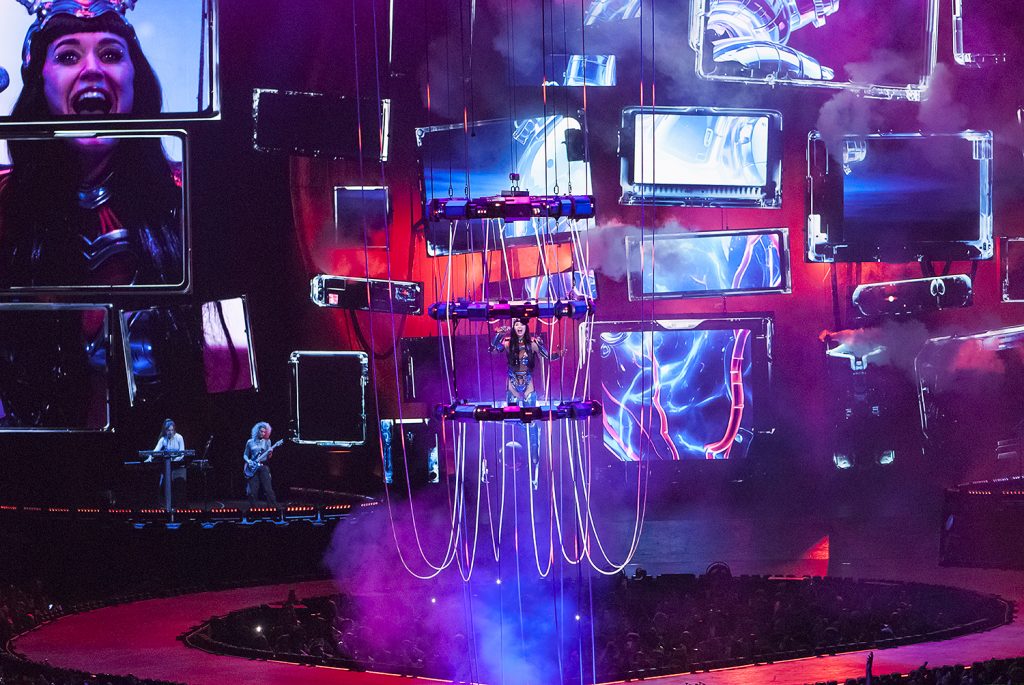 No merecía menos: Perry se elevó (de forma literal) a las alturas desde el primer instante, con su cabeza conectada a una maraña de cables como si estuviera en «Matrix» y con una refrescante falta de sentido del ridículo. Las referencias a la ciencia-ficción serían constantes durante toda la noche, separando el concierto en bloques que pretendían ser niveles de videojuego.