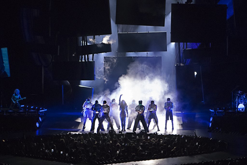 Si las fotos que acompañan a esta crónica parecen hechas desde la azotea del Corte Inglés colindante con el Movistar Arena no es porque el promotor odie a la prensa, sino porque, en efecto, los fotógrafos no podían ubicarse en ninguna parte del foso escénico sin estorbar. Docenas de personas trabajaban por debajo de la superficie de esa Cinta de Moebius que ocupaba el centro de la pista del recinto y que recorrerían un centenar de veces Perry y sus bailarines, a veces esprintando como velocistas en una carrera.