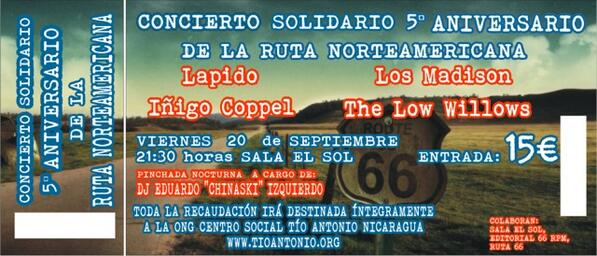 El próximo viernes 20 de septiembre tendrá lugar en la Sala El Sol de Madrid el Concierto Solidario 5º Aniversario de La Ruta Norteamericana, conocido blog musical incrustado en la web del diario El País conducido por el periodista Fernando Navarro, experto en la música tradicional de aquella zona del mundo.