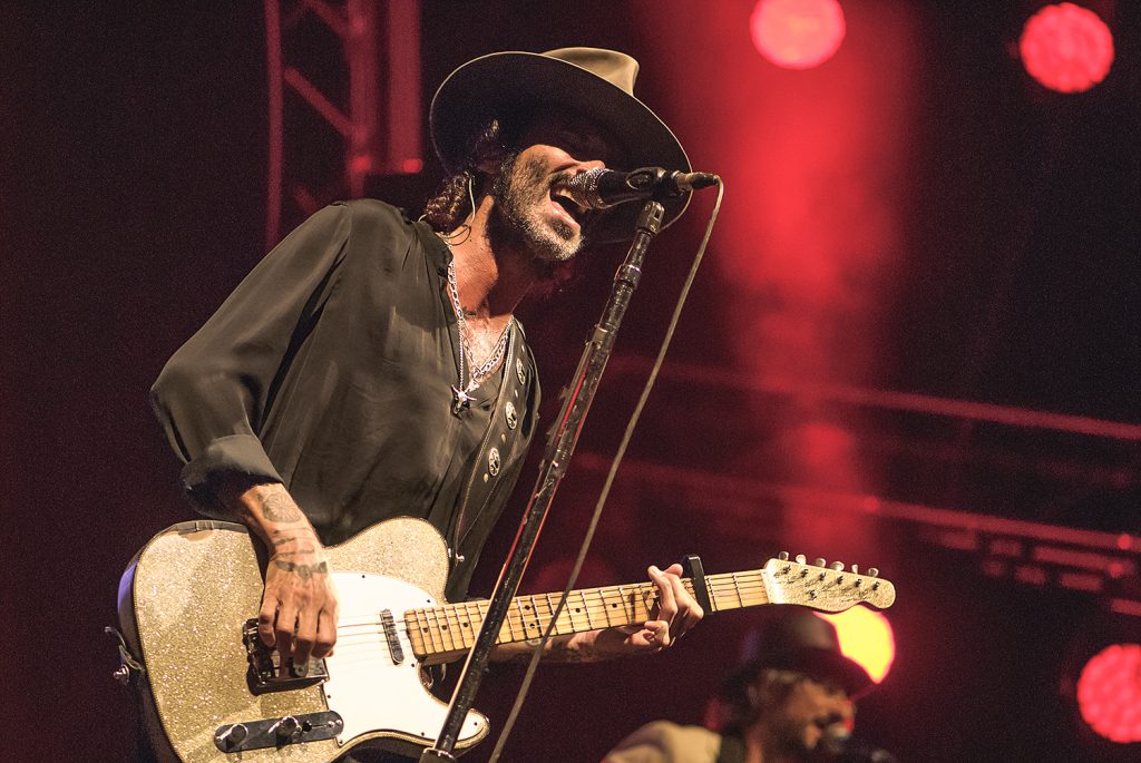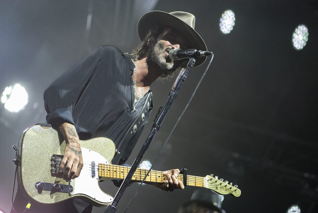 No me dio tiempo a reflexionar mucho más sobre el pasado porque la Leiband se desplegó sobre el escenario a las once y pico (bendita laxitud veraniega de provincias: los madrileños ya hemos normalizado lo de ir a conciertos de rock con el sol todavía en alto) mientras sonaba en el hilo el estribillo de ‘Gigante‘. Todos vestían de traje blanco salvo el último en subir, ese cantante de silueta escuálida tan reconocible por los andares, la nariz y el sombrero de ala ancha. Al trasluz, parece su propia versión en cómic.
