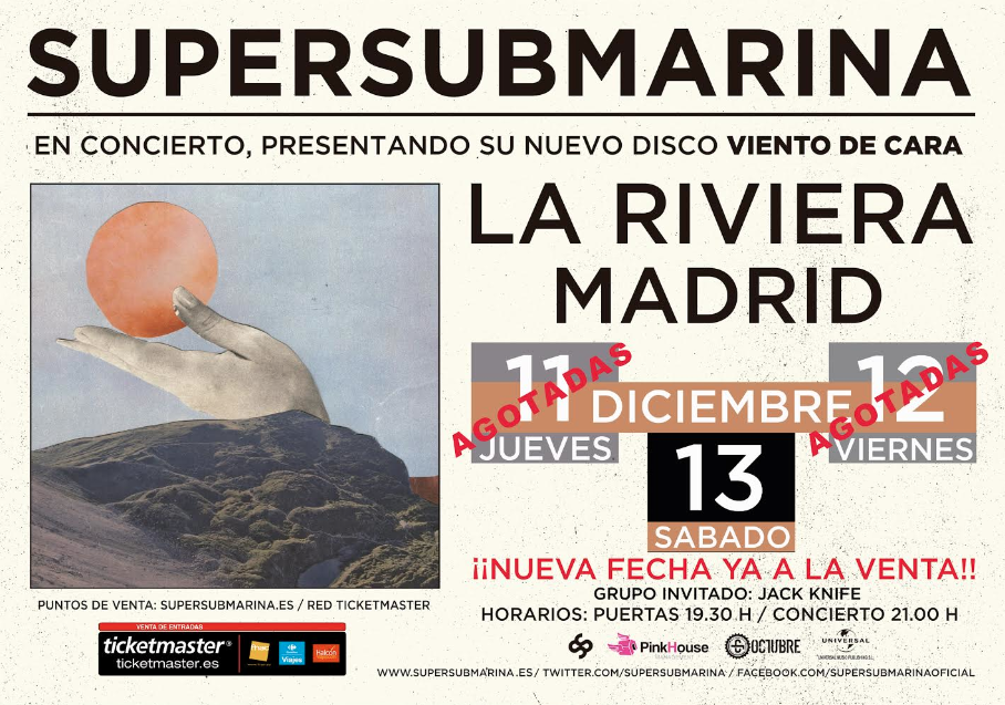 Después de agotar las entradas de los conciertos en Madrid del jueves 11 y viernes 12 de diciembre con más de dos meses de antelación, Supersubmarina anuncia el sábado 13 de diciembre como nueva fecha en la sala La Riviera y las entradas ya están a la venta en Ticketmaster.