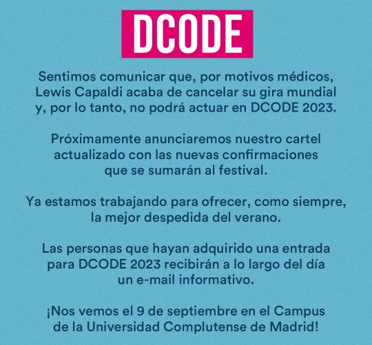 A finales de junio el DCode 2023 perdía a su cabeza de cartel, Lewis Capaldi, y ahora, tres semanas después, queda oficialmente cancelado. El festival madrileño no ha podido reponerse de la cancelación de la gira del británico y encontrar un recambio a la altura, por lo que ha optado directamente por suspender y devolver […]