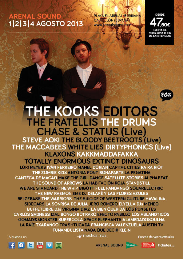 EDITORS – WHITE LIES – TOTALLY ENORMOUS EXTINCT DINOSAURS – DIRTYPHONICS LIVE – CAPITAL CITIES – LORI MEYERS – ANTÒNIA FONT – IVÁN FERREIRO – STEVE AOKI – THE FRATELLIS – THE DRUMS – THE BLOODY BEETROOTS (LIVE) – THE MACCABEES – KLAXONS – ALPHABEAT – THE NEW RAEMON – LOS PUNSETES – BONAPARTE – THE SOUND OF ARROWS – DORIAN – SATELLITE STORIES – THE ZOMBIE KIDS – LA HABITACIÓN ROJA – STANDSTILL – WE ARE STANDARD – THE WHIP – BIGOTT – FUEL FANDANGO – EME DJ – DELAFÉ Y LAS FLORES AZULES – THE SUICIDE OF WESTERN CULTURE – JERO ROMERO – HAVALINA – LA BIEN QUERIDA – AUSTIN T.V – GOMAD!&MONSTER – CARLOS SADNESS – BELZEBASS – IZAL – KLEIN