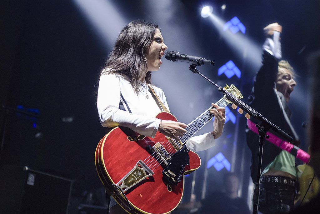 Por cierto, me flipa la evolución de la vocalista en cuanto a estética, pasando del look de chica buena pero «cool» del pasado a la apariencia mucho más «malota» con la que se nos presenta hoy: pelo rabiosamente negro y una combinación de vestuario y maquillaje que parecen advertir «apártate de mi camino». Aunque su «Hola, ¿están bien?» del principio y su sonriente «te amo, España» de poquito antes de terminar desmienten esa impostura. En la primera línea del frente la acompañan sus compis Jeff Oddie y Theo Ellis a guitarra y bajo, quienes se pasan todo el concierto sonriendo, animando al público y saltando. Dan la sensación de estar gozándolo tanto que por sus caras dirías que están en el patio del colegio.